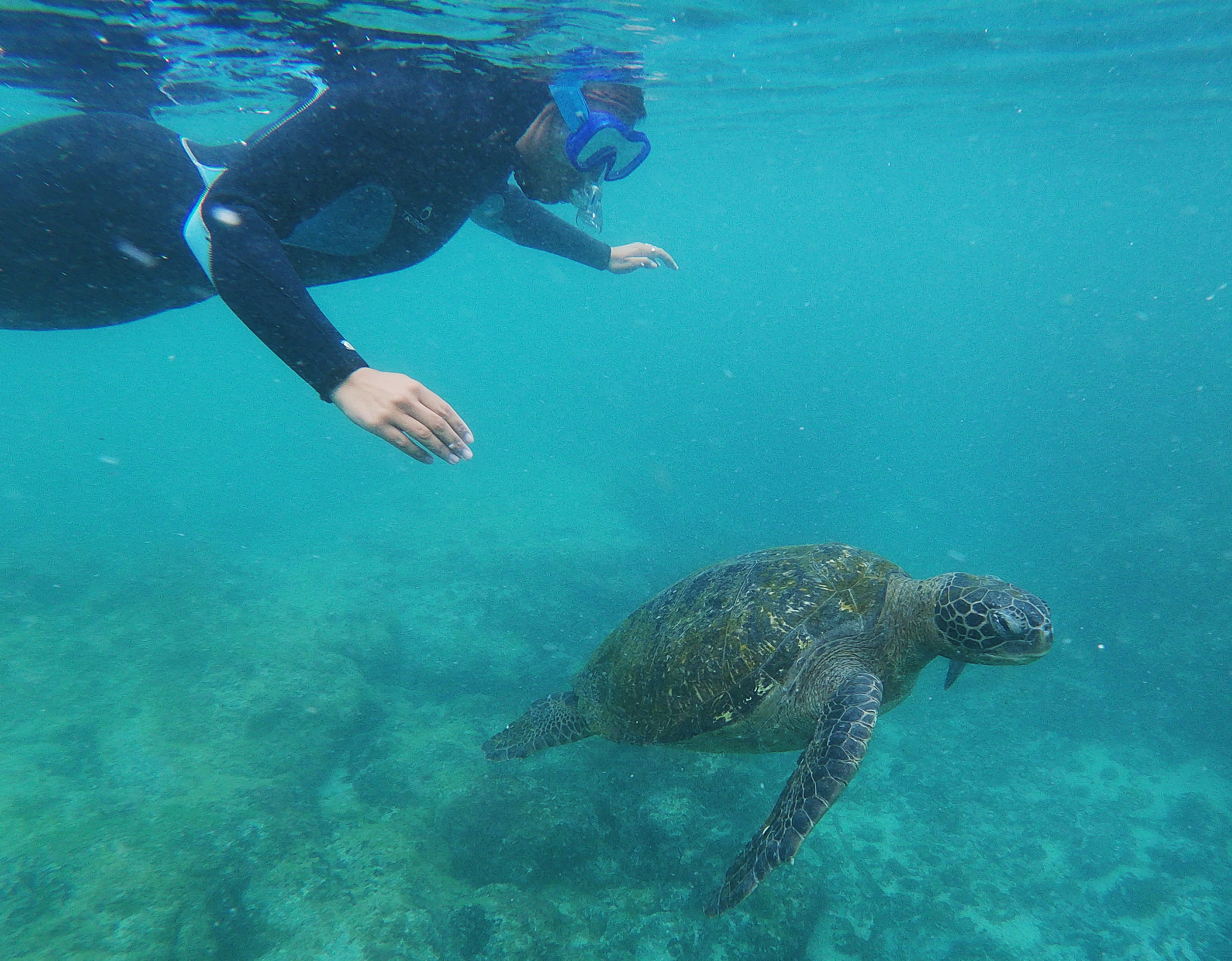 La lagune de Concha de Perla est une piscine naturelle construite par le temps et l’érosion. Son eau limpide et calme permet à de nombreux poissons de se reproduire. Nous avons eu l’occasion de vivre des moments suspendus au milieu de nombreuses tortues, de jeunes raies aigles dont nous suivons le rythme comme obnubilés, d’otaries jouant entre nos corps immergés, d’iguanes marins et autres poissons de récif. Nos pensées sont constamment accompagnées par ces observations et rien ne vient perturber le rythme naturel et doux que ces êtres simples et fascinants créent en nous.