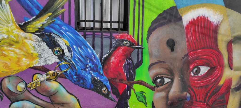 Une nouvelle journée nous attend. Laura, du Zippytour13, nous accueille à la sortie du métro avec sa casquette et son T-shirt bleu. Elle nous explique très vite avoir grandi ici et y vivre encore. Ici, c’est la Comuna 13, détentrice il y a encore peu de temps du titre du quartier le plus dangereux au monde. Nous déambulons dans ces rues animées, colorées où les afro-colombiens posent leurs pas sur des beats entrainant sur fond de graffitis réalisés par les meilleurs artistes du monde. Le contraste entre le discours de la guide narrant l’histoire du quartier et l’ambiance actuelle est saisissant. En effet, la Comuna 13 fut pendant des années le carrefour sanglant des contrebandiers, guerreros, narco-trafiquants, paramilitaires. Idéalement situé, à la frontière de la ville, le quartier permettait aux groupes armés de transporter la drogue et l’argent de et vers la côte à travers des pistes non reconnues. Principalement aux mains des milices d’extrême gauche, le quartier subissait quotidiennement les affres d’une violence impossible à juguler. Les jeunes du quartier rejoignaient, sous la pression ou avec la carotte de l’argent et du pouvoir, les factions armés et faisaient régner l’ordre par la terreur et la répression des habitants. Les paramilitaires, armés civiles autoorganisées pour lutter contre les guerreros, infiltrait des membres pour permettre des exterminations et interventions dévastatrices. Ainsi, narcotrafiquants, guerreros et paramilitaires se disputaient un quartier stratégique pour l’acheminement de la drogue vers la côte. En 2002, le gouvernement a lancé deux opérations (Mariscal et Orion) pour lutter contre les milices de la zone et stopper le développement de la terreur. Pendant des jours entiers, les hélicoptères de l’armée d’Etat sulfataient les groupes armés et les habitants de balles, poussant ainsi les habitants à tendre des draps blancs sur les terrasses en signe de paix et de protestation contre ces interventions touchant injustement les civils non armés. Même si ces opérations se soldent par la fin de la mainmise des groupes armés sur la Comuna, le succès militaire fut acquis par le franchissement de plusieurs droits humains et par la mort de nombreux civils. Il faut dire que le conflit à tuer plus de 1500 personnes en 2 ans dans un quartier d’à peine plus de 130 000 personnes. Aujourd’hui encore nombreuses sont les familles qui demandent des comptes à l’Etat sur la disparition de leurs proches, probablement enterrés dans la carrière convertie en fosse commune jouxtant la Comuna.