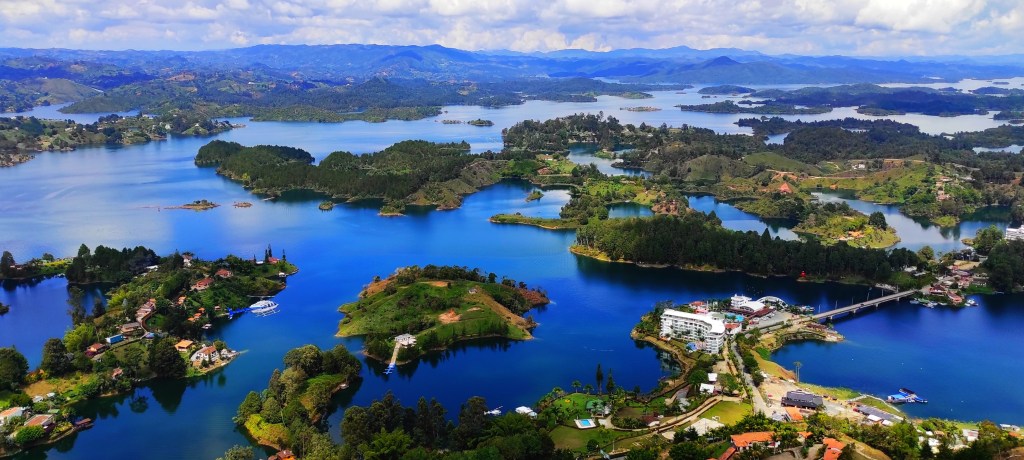 Après 80km de paysages variés, le bus nous dépose face à une station-service où nous attrapons un tuk-tuk pour monter sans effort au pied de la Piedra del Penol. Après nous être demandés à plusieurs reprises si nous n’étions pas trop lourds pour ce petit moteur dans ces côtes un peu trop pentues, se dresse devant nous ce gros caillou. Les infrastructures autour de lui témoignent de l’importance des afflux touristiques en période « normale ». Après avoir payé les 5€ d’entrée, nous accédons aux 740 et quelques marches. Nous avons très vite abandonné notre tentative de les compter pour mettre fin à un débat entre internautes sur le nombre à gravir. La Piedra, haute de 220m est une roche refroidie dans les chambres magmatiques il y a 80 millions d’années, qui est lentement remontée à la surface par l’effet de la corrosion et des mouvements tectoniques. Après un peu de sueurs, nous découvrons la vue à 360° qui nous offre un paysage où le bleu de l’eau, le vert des collines et la clarté du ciel se complètent parfaitement sur tout l’horizon. La represa a été construite dans les années 70, nécessitant la démolition de la zone urbaine d’El Penol et le relogement de plus de 3000 personnes, se déversant ainsi sur ¼ du territoire de Guatape. Cet évènement fut un drame pour les habitants obligés de fuir leur territoire. Il s’agit aujourd’hui du plus grand lac de la région d’Antioquia et l’un des plus grands écosystèmes lentiques de Colombie.