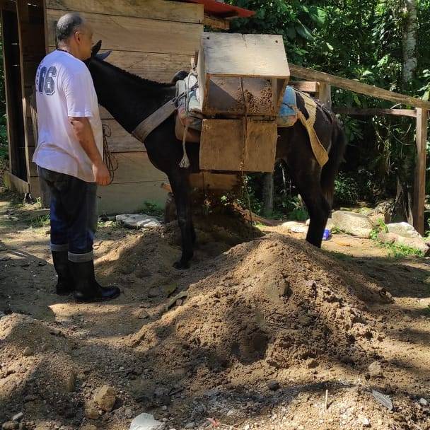 - Extraction de sable dans la rivière et acheminement jusqu’au chantier à l’aide de sacs et de mules.