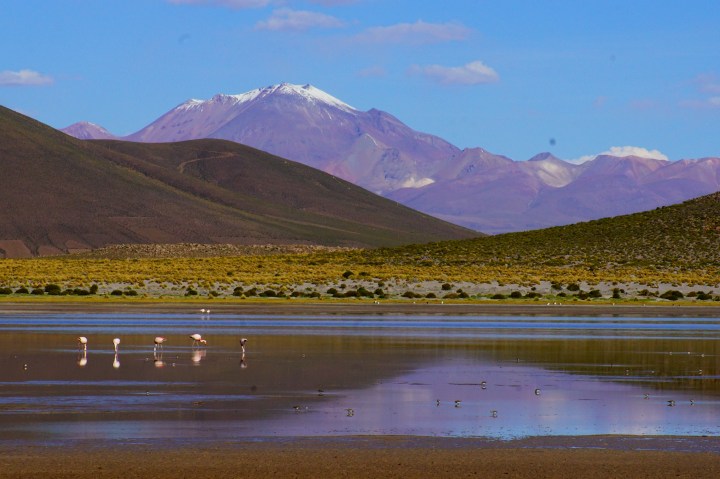 Le chemin se poursuit infiniment et nous ne croisons aucun 4×4 tellement la région du Sud Lipez est vaste (la Bolivie est un pays faisant deux fois la superficie de la France mais comportant seulement 11 millions d’habitants). Après quelques heures de pistes, nous nous posons dans la vallée des lamas pour déjeuner. Nous apprendrons que ces animaux, somptueux et un brin snobs, font leur besoin toujours au même endroit afin de pouvoir, le soir venu, se coucher dessus et se tenir au chaud. Cependant il faut s’assurer du terrain dans lequel ils vont dormir car le soir leurs prédateurs, renards, chats des Andes ou encore pumas, guettent l’animal égaré du troupeau. Ici c’est le vert qui domine et nous rappelle les paysages écossais. C’est incroyable comment une région peut nous donner l’impression de parcourir plusieurs pays, Etats-Unis, Kenya, Jordanie, Ecosse, Erg Saharien, Nouvelle Zélande, chacun y va de ces souvenirs. C’est fascinant de constater les richesses naturelles de ce pays, sans doute l’un des plus beau du monde.