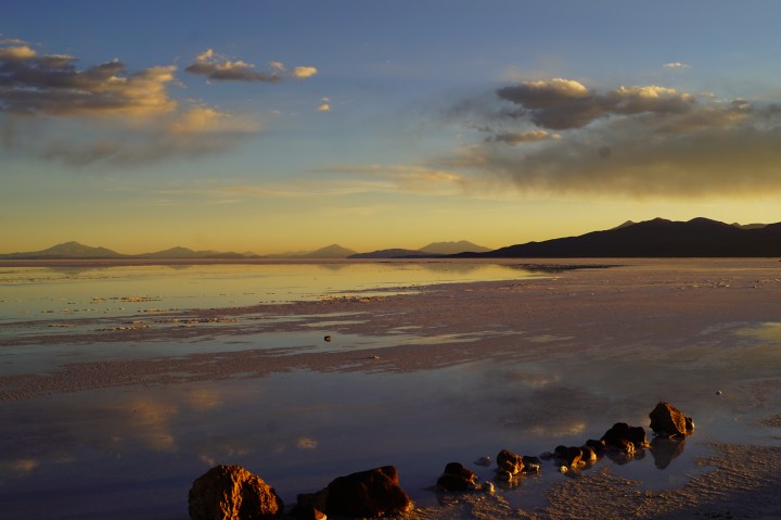 Avant d’aller trouver chaleur et réconfort dans notre hôtel bâti du sol au plafond de sel, nous nous accordons un dernier moment de communion avec la beauté unique de ce désert. Alors que le Soleil se dirige lentement derrière la montagne et que la Lune se hisse un peu plus haut, le bleu, l’orange, la jaune, le rouge, le rose et le violet viennent se refléter sur les fines particules d’eau qui recouvrent le sol. Une beauté éphémère qui nous élève au rang de Privilégiés.