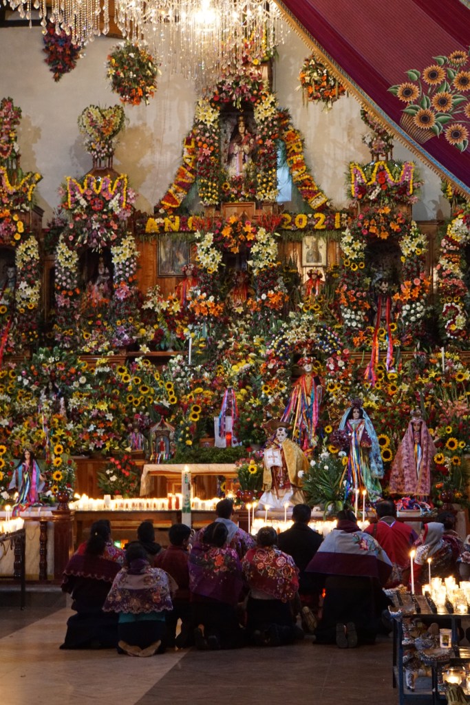 Elle nous explique avoir appris ce métier de sa mère avec qui elle vit ici dans la maison juxtaposée à la boutique. Tous les produits exposés là ne sont pas les siens, elle propose à 15 femmes de disposer gratuitement de cet espace pour vendre leurs pièces. Tout l’argent de la vente revient entièrement à celle qui a conçu le produit et non à celle qui la vend. La journée d’une tisseuse commence comme les journées de beaucoup de femmes de la région, par la préparation des tortillas. Elles récupèrent ainsi l’amidon du maïs avec lequel elles cuisinent pour baigner les fils qu’elles feront ensuite sécher à la chaleur des comales. Métiers à tisser autour de la taille elles travaillent sans relâche jusqu’à 20h. Ensuite elles se « reposent » dans leur maison en brodant jusqu’à 22h… Après avoir acheté quelques échantillons pour le business de Tine, dont Juana a insisté pour lui faire des prix (les négociations inversées !), nous profitons du calme après la tempête pour se promener et entrons à nouveau dans l’Eglise du village. Les saints, enfermés dans leur boite vitrée, entourent également cette nef, mais cette fois ce qui me marque d’abord ce sont ces fleurs qui ornent en abondance l’Eglise. Zinacantan est entouré de cultures très importantes de fleurs aux formes et couleurs si variées. L’Eglise San Jose en est ainsi recouverte de façon démesurée, si bien qu’il faut du temps avant de remarquer les petites statuettes d’animaux sacrés disposés sous les bougies. Hérités des croyances précolombiennes, les nahuales représentent des chiens et des bœufs ayant le pouvoir de faire le bien et le mal. Plus curieux encore, des petits miroirs sont accrochés aux murs un peu partout. Si j’ai probablement dû m’en servir pour me recoiffer, ils sont là en réalité pour entrer plus facilement en connexion avec les saints et inviter à l’introspection.