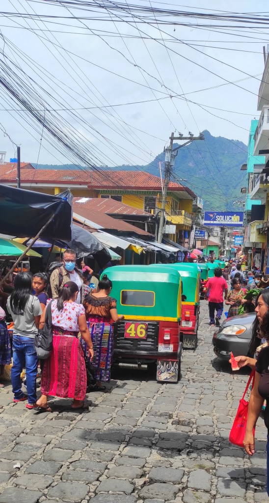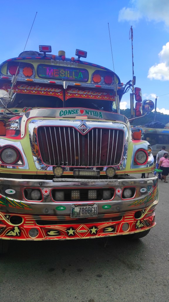 La Mesia. Notre première frontière terrestre traversée depuis le début de notre périple. Nous aurions aimé en traverser davantage mais le COVID ayant fermé la plupart des frontières terrestres nous avons été contraints de privilégier les voies aériennes. De sa rue principale, notre première ville guatémaltèque ressemble surtout à un grand marché où seuls les tuk-tuks circulent. A peine munis de Quetzales, nous en chopons un pour rejoindre la gare routière à quelques mètres de là… le temps d’observer cette nouvelle monnaie qui porte le même nom que l’oiseau symbole national du Guatemala. Les longues plumes turquoise de sa queue étaient en fait utilisés par les mayas comme monnaie ! Finalement, on nous arrête en plein milieu de la route pour nous faire monter dans un immense bus bariolé. C’est ce qu’on appelle en Amérique centrale, un Chicken Bus. Il s’agit en réalité d’anciens autobus scolaires nord-américains quelques peu améliorés : couleurs vives, klaxons aux mélodies exubérantes, leds, sono, stickers, statuts de Jésus et autres grigris. On les appellerait ainsi en raison des nombreux animaux que les passagers transporteraient dans ces bus… En ce qui nous concerne, nous n’avons pas vu à proprement parlé d’animaux mais nous avions davantage l’impression d’être nous-mêmes du bétail transporté. Le bus surchargé persiste à s’arrêter prendre de nouveaux passagers alors qu’il roule de plus en plus vite, n’hésitant pas à doubler dans les virages. Nous comprenons à présent pourquoi la protection divine est primordiale. Mais d’autres bus ne devaient pas avoir les amulettes nécessaires car au bout de plusieurs heures de route, nous nous retrouvons bloqués face à un accident qui vient tout juste de se produire entre un camion et un chicken bus. Les passagers sortent un à un de ce dernier, ensanglantés, alors que le chauffeur du camion semble être coincé dans son véhicule. Nous sommes tout de suite rassurés, il n’y a pas de mort, « juste » des blessés légers et des traumatisés. A l’arrivée des premiers secours, le chauffeur du camion trouve finalement le moyen de s’extraire avant de prendre la fuite en boitant. Personne ne le rattrape et nous quittons cette scène étrange pour rejoindre un autre itinéraire quelque peu bancal. Nous traversons alors des zones d’éboulements non sécurisées avant de passer une nuit-étape à Quetzaltenango.