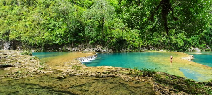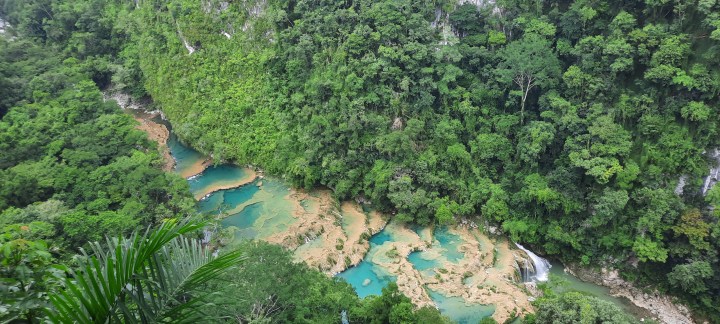 Si nous sommes à Lanquin c’est avant tout pour nous rendre dans l’aire protégée de Semuc Champey, qui signifie en maya « là où la rivière se cache » … Nous nous hâtons de descendre de l’arrière du pick-up pour devancer les quelques autres touristes et nous empruntons le sentier aménagé qui traverse une épaisse forêt subtropicale pour atteindre le mirador. Nous avions peur que le ciel gris empêche la magie d’opérer mais c’est avec grande émotion que nous découvrons cette vue digne d’un conte de fée : entre une falaise mangée par une végétation luxuriante et la jungle, se dégage une série de piscines naturelles turquoises. Alimentés par la rivière Cahabon, ces bassins ruissellent sur 350m sur une pierre riche en calcaire leur donnant cette couleur extraordinaire.