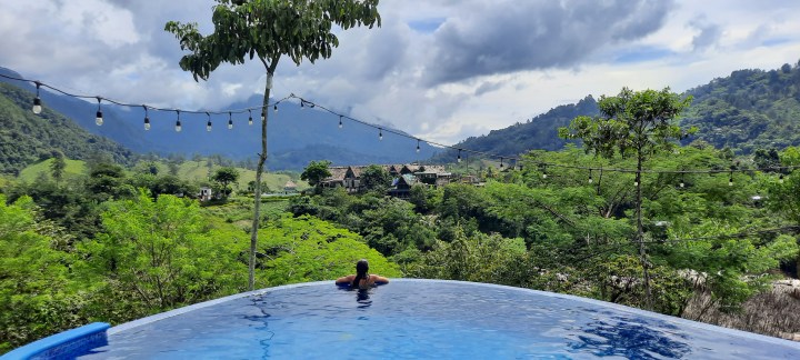 Nous quittons ce territoire vibrant en colectivo pour nous rendre à Lanquin… Un long trajet où nous passons par l’immense et peu attrayante Guatemala City puis par ces décors verts et sauvages. Lanquin n’est qu’à 380m d’altitude et a pourtant des airs de montagnes avec ses routes sinueuses et ses dénivelés. Un tuktuk nous dépose à Vista Verde, un de ces hôtels du coin qui semble avoir privatisé une colline entière pour y poser sa piscine et quelques cabanes.