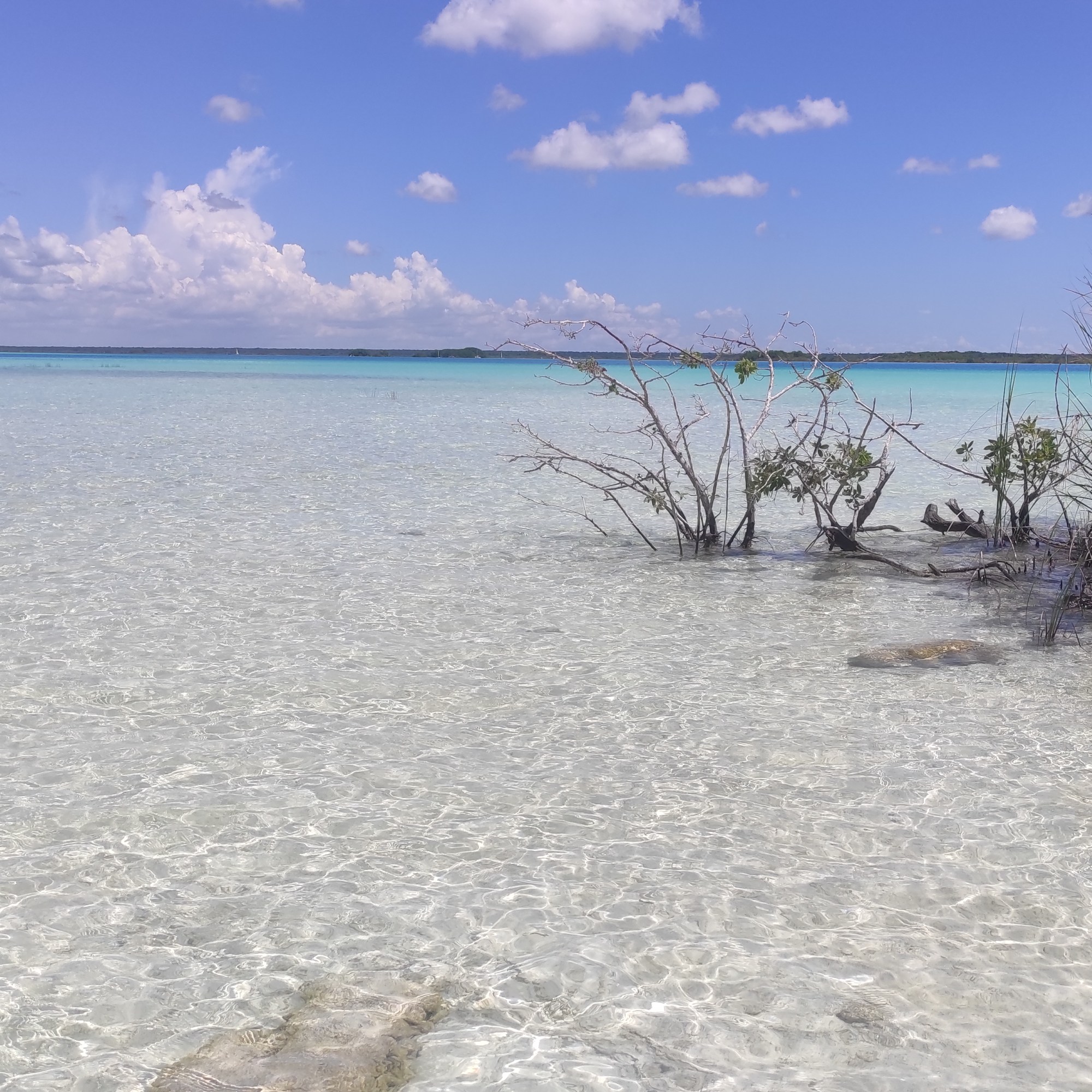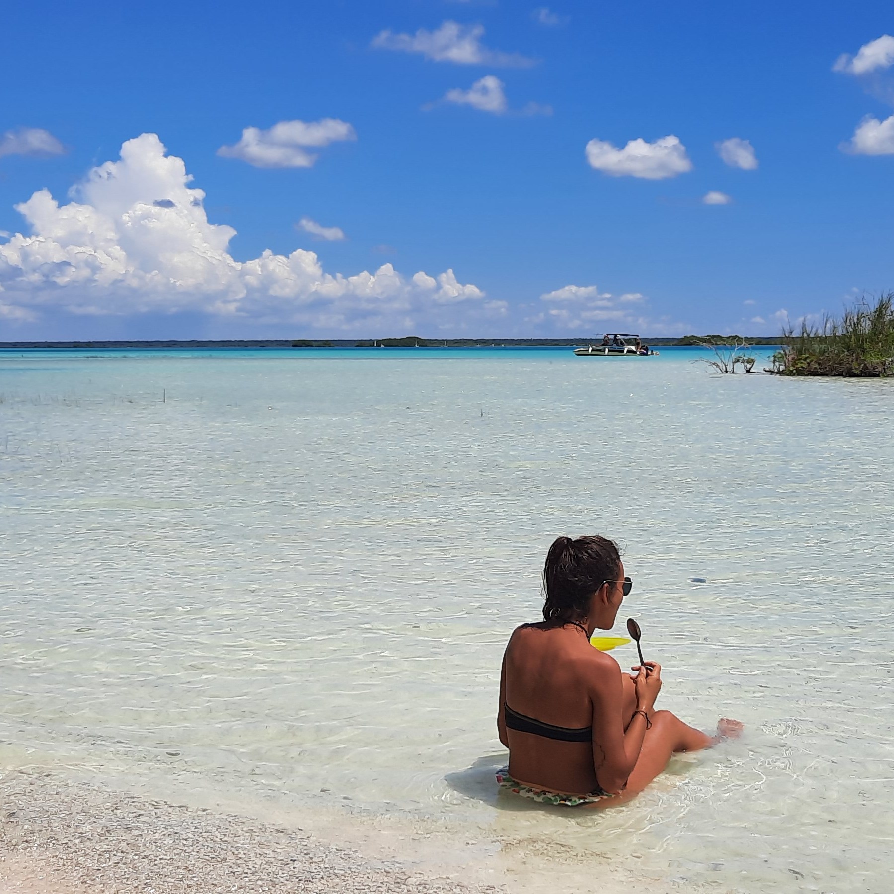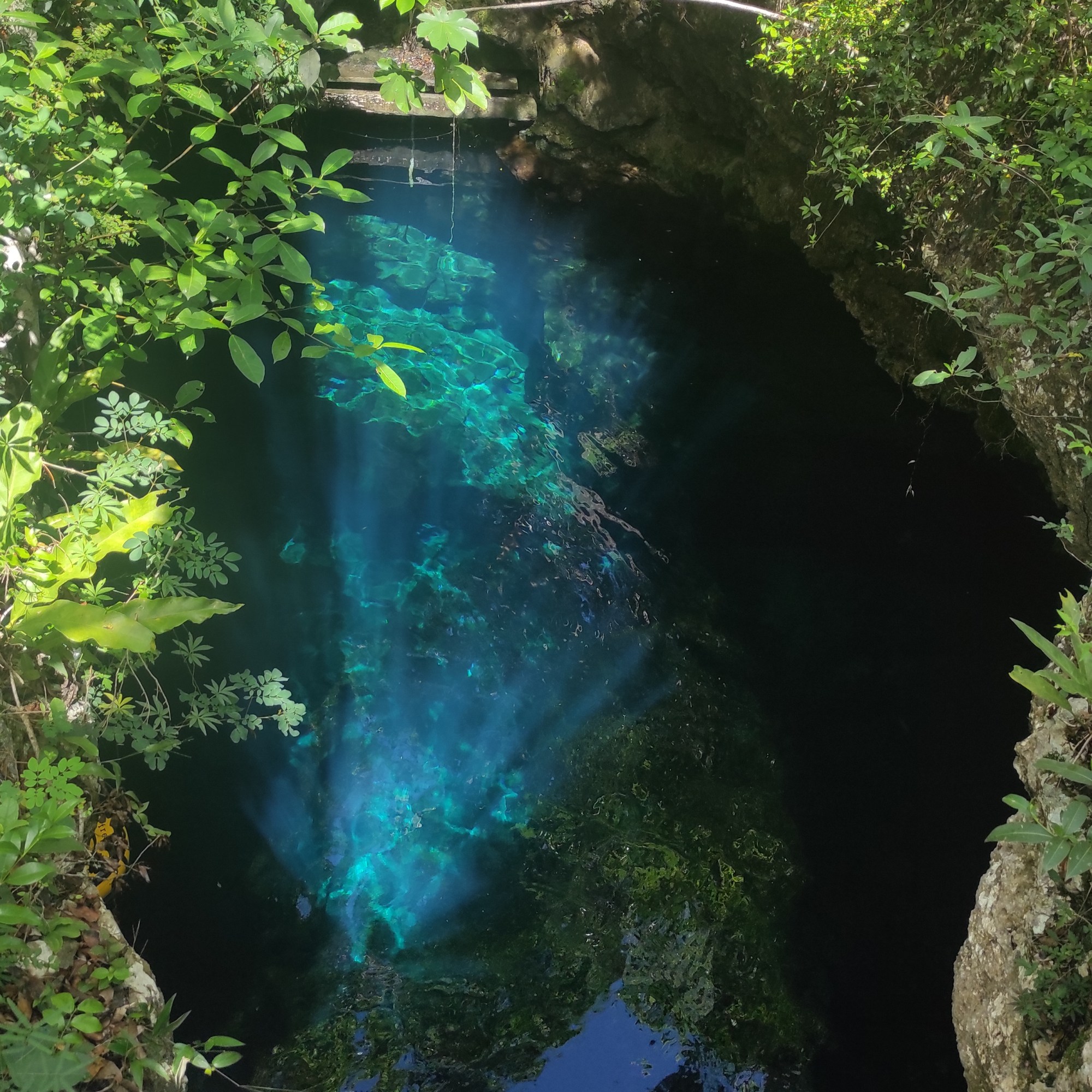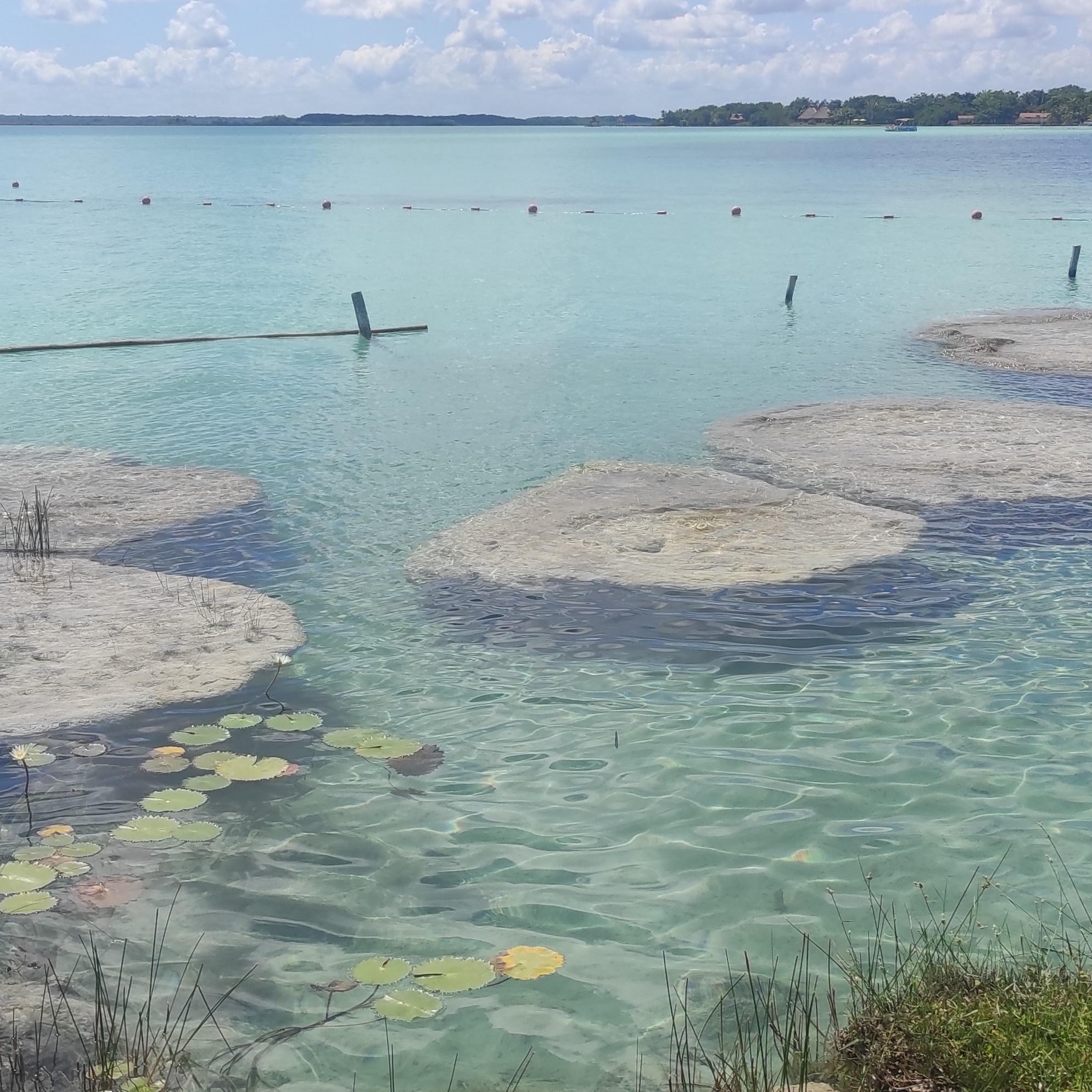 Le lendemain nous passons du temps dans deux cénotes. Le premier, celui de Cocalitos, est assez singulière car elle se trouve directement dans la lagune. Un eau turquoise paradisiaque et peu profonde qui devient un gouffre obscur de plusieurs dizaines de mètres. En raison de courant trop dangereux pour s’y rapprocher, nous profitons des hamacs dans l’eau pour se relaxer et nous prenons le temps d’observer les stromatolithes. Il s’agit de formations rocheuses calcaires d’origine biologique (de la vie les constitue) et sédimentaire (plusieurs sédiments sont emprisonnés dans les couches successives). Ce sont les formations biologiques les plus anciennes recensées sur Terre car elles vivent de façon presque stable depuis plus de 3,5 milliard d’années. Rares sont les endroits dans le monde où les observer.