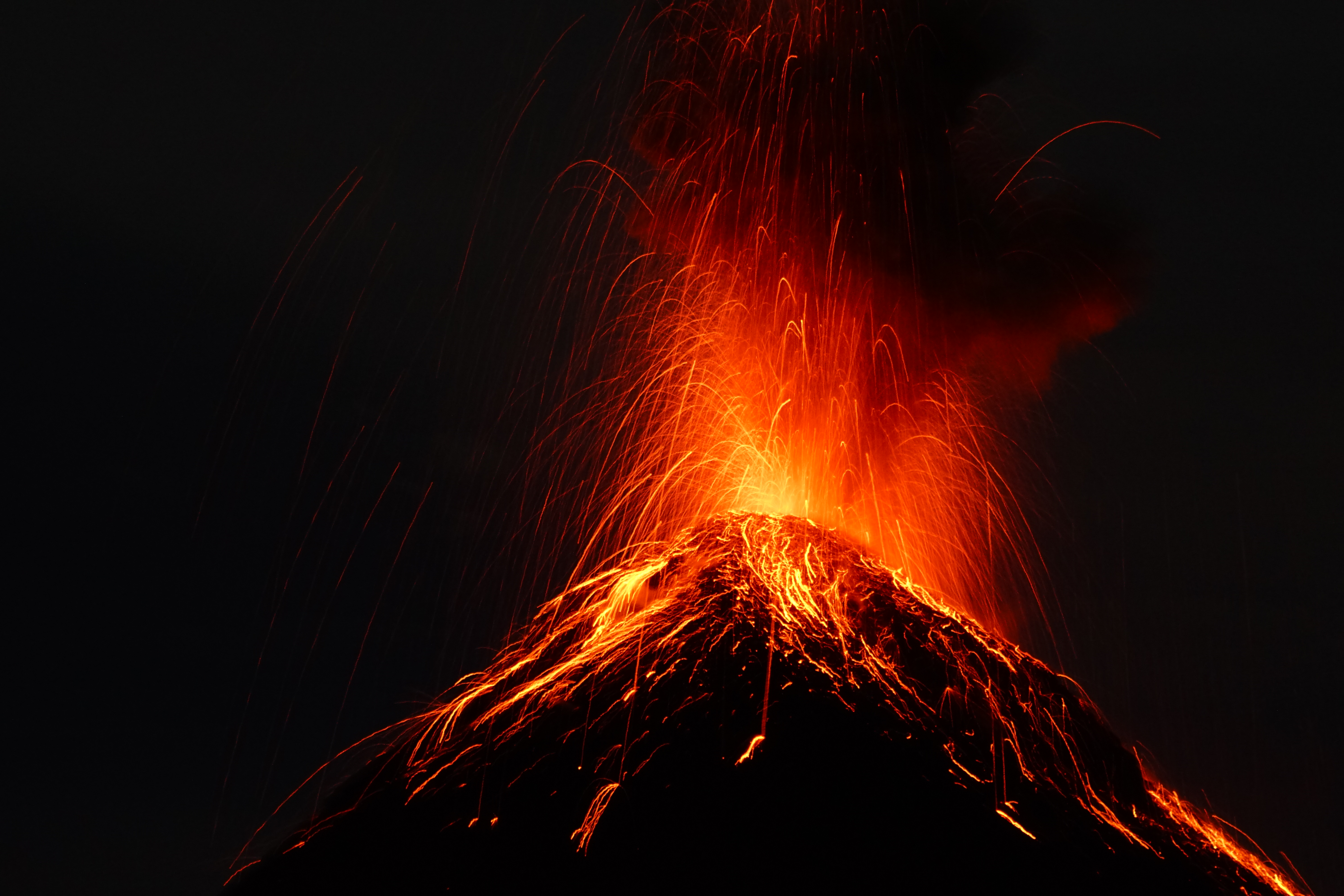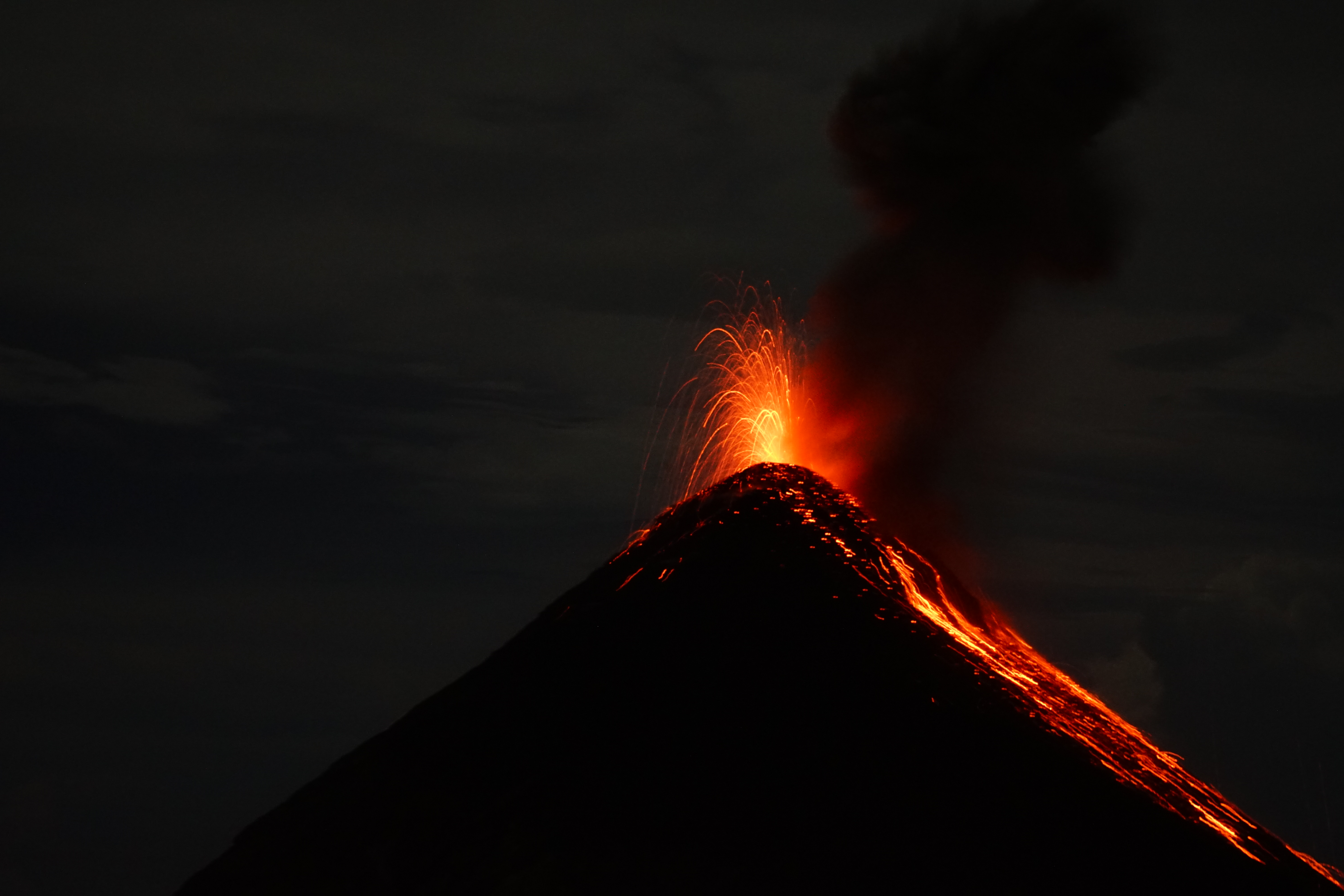 En murmures, nous faisons la connaissance de nos compagnons d’aventure : une mère et son fils de 14 ans, suisses allemands en voyage depuis plus d’un an eux aussi et un jeune couple d’Indiens vivants aux Etats-Unis et en vacances dans ce pays merveilleux, nourrissant et surprenant. A 21h, nous décidons de profiter que le ciel soit dégagé pour nous approcher du cratère del Fuego. L’indienne, n’ayant pas de chaussures de randonnée, part en sandales et sans frontale alors que la suisse allemande, étant en mauvaise santé, peine à se déplacer, ce qui nous oblige à adopter un rythme très, très lent. La mère fera finalement demi-tour laissant son fils et ses chiens partir avec nous. Nos corps sont fatigués mais l’excitation d’être aussi proches d’une éruption porte nos pas. Alors que 30 mètres nous séparent de notre arrivée, nous sentons le sol trembler avant de voir ce puissant crachat partir dans les airs dans un bruit assourdissant. De quoi donner aux plus fatigués d’entre nous le courage d’accélérer le pas.
