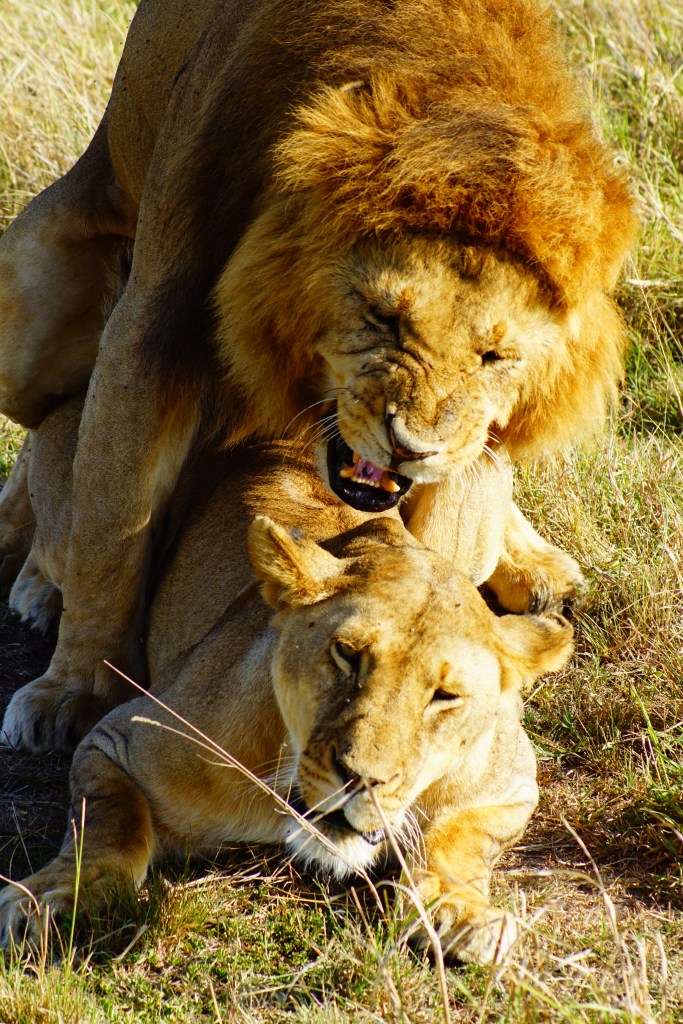 En 1h, en plus d’un magnifique couché de soleil, nous avons déjà vu girafes, éléphant, autruches, buffles, zèbres, gazelles, gnous et même un couple de lions, caché dans les herbes hautes et sèches, faisant la sieste et profitant du réveil pour se reproduire en 3/4 secondes. Lors de la période de reproduction qui ne dure que 96h, les lions et lionnes s’adonnent à ce qu’on pourrait appeler un marathon sexuel en s’accouplant toutes les 15 minutes environ, pouvant ainsi aller jusqu’à 50 actes en une journée.