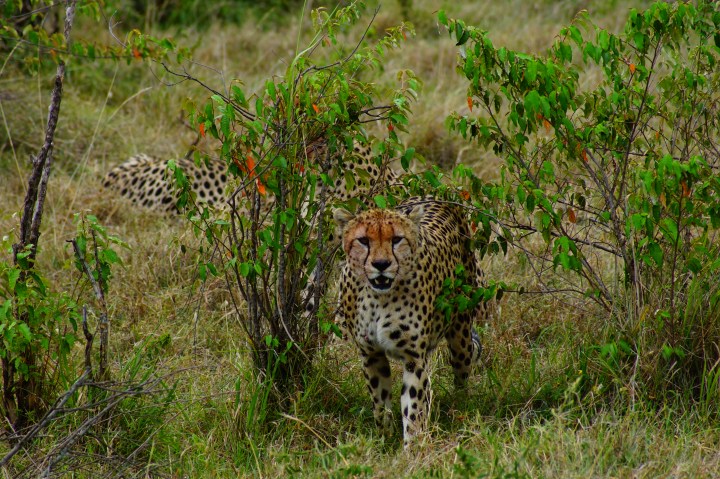 Ensuite nous verrons plusieurs buffles en famille se nourrir tranquillement dans les prairies. Nous apercevrons à plusieurs reprises des guépards marcher tranquillement et se remettre d’un repas fraîchement partagé, les babines encore recouvertes de sang. Nous avons la chance de rencontrer une espace très rare, le rhinocéros noir. Ils sont 600 au Kenya et malgré son nom, ce n’est pas sa couleur qui le distingue du rhinocéros blanc, mais plutôt sa gueule large. Le pauvre, effrayé par les voitures qui l’encercle, il court il court, petit oiseau sur son dos. Les éléphants sont là aussi pour nous émerveiller. Ils se déplacent majestueusement en famille pour dénuder les arbres pour se nourrir.