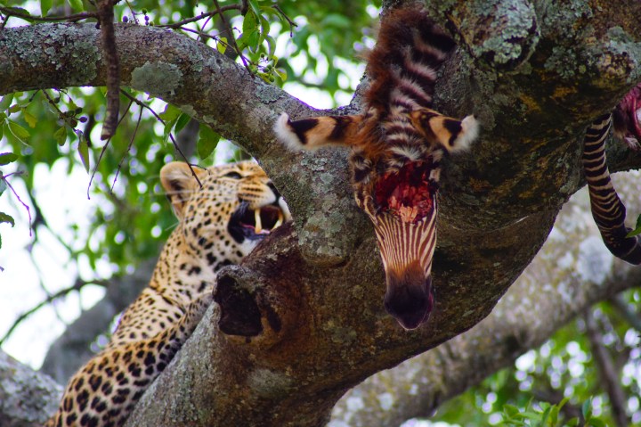 Alors que la maman léopard se réveille, nous la voyons grimper un peu plus haut à l’arbre où l’on aperçoit une tête de bébé zèbre pendre : ce cadavre avait dû être gardé pour le repas du soir dans ce lieu inaccessible pour les lions. Conscients d’assister à une scène unique, nous retenons notre souffle et nous nous imprégnons de ce moment magique.