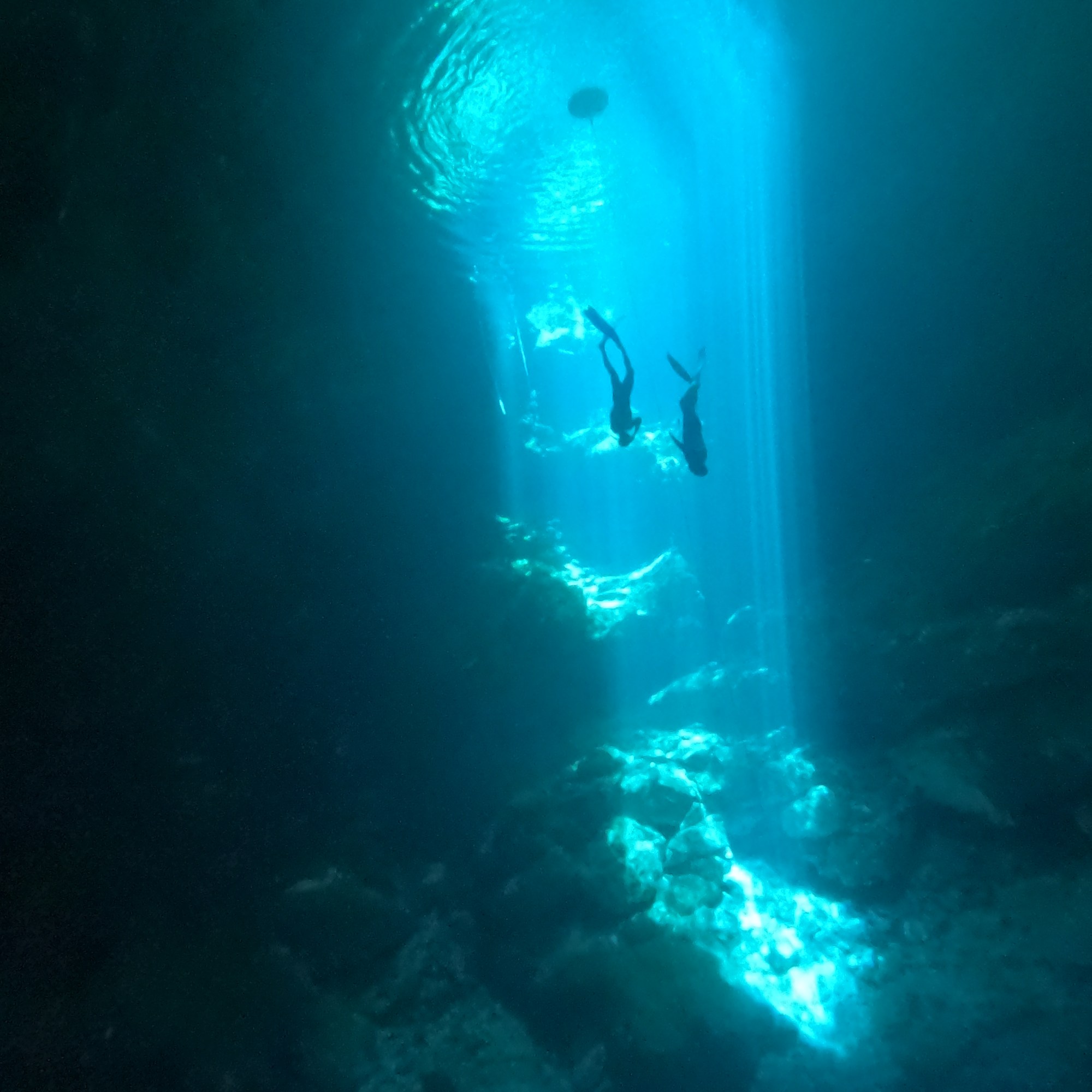 C’est Anthony qui commencera à plonger à 30m de profondeur dans un cenote faisant 60 mètre de profondeur. The Pit est une petite cavité de surface mais renfermant un gouffre énorme. La descente se fait à la lampe torche, le temps de contourner des monticules de roches empilées depuis le fond et finir par découvrir les faisceaux lumineux partant de la surface, 30m au dessus de lui, et plonger vers ce qui semble être l’infini. Quelle merveille, quelle chance de découvrir cet univers.