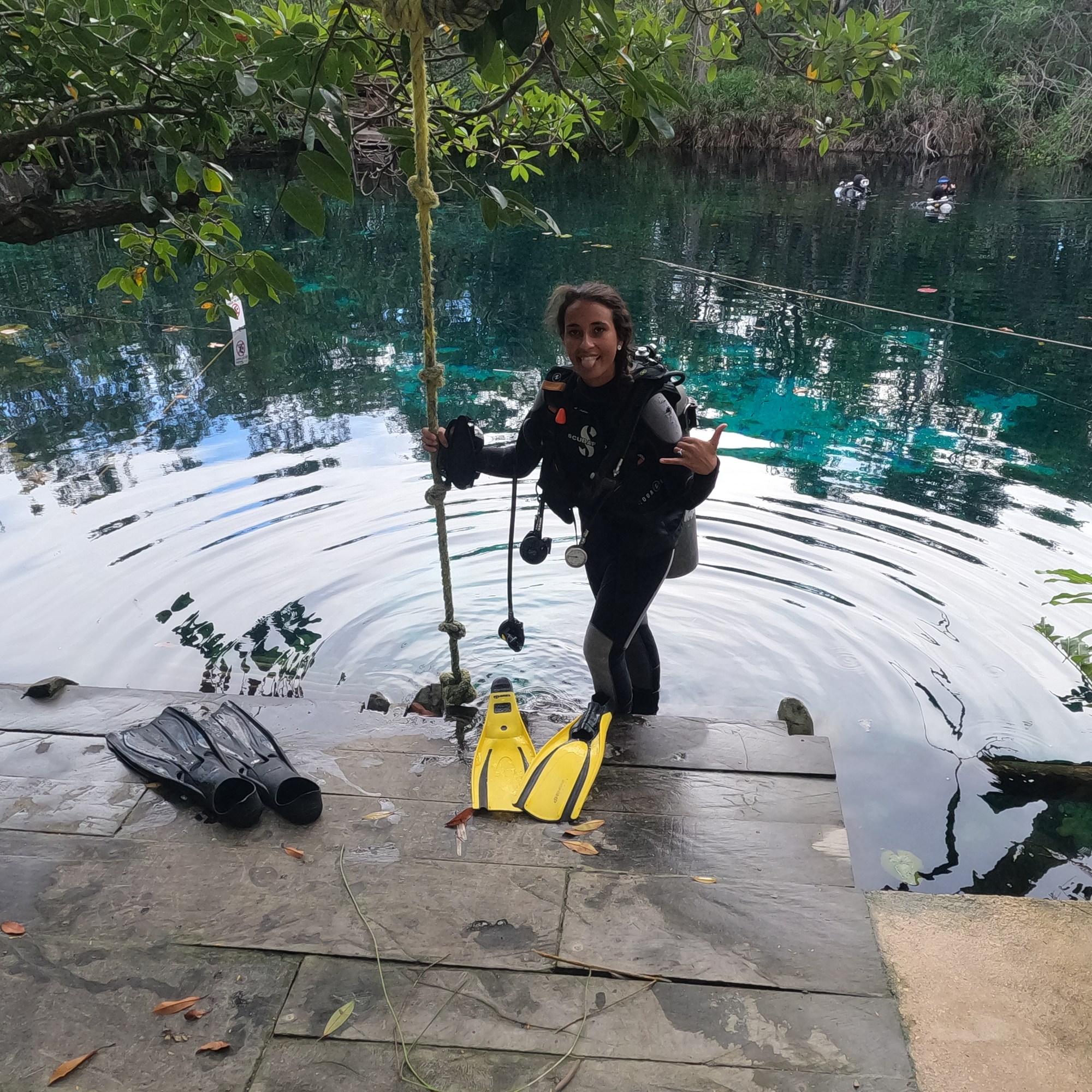 Cristel se joint ensuite à la palanquée pour découvrir Dos Ojos, un cenote peu profond permettant d’avoir un premier vrai contact avec la plongée en grotte. En effet, ce qui distingue une plongée en mer d’une plongée en cénote c’est que dans un réseau sous terrain, nous ne pouvons pas remonter directement à la surface, nous sommes dans des grottes obscures et nous devons rejoindre le point de mise à l’eau pour sortir. Un aspect technique qui décuple la peur mais aussi et surtout l’excitation. Nous suivons donc notre guide, lampe torche en main, sans perdre de vue le fil d’Ariane situé à un mètre en dessous et nous permettant de ne pas se perdre dans ces labyrinthes sous terrains.