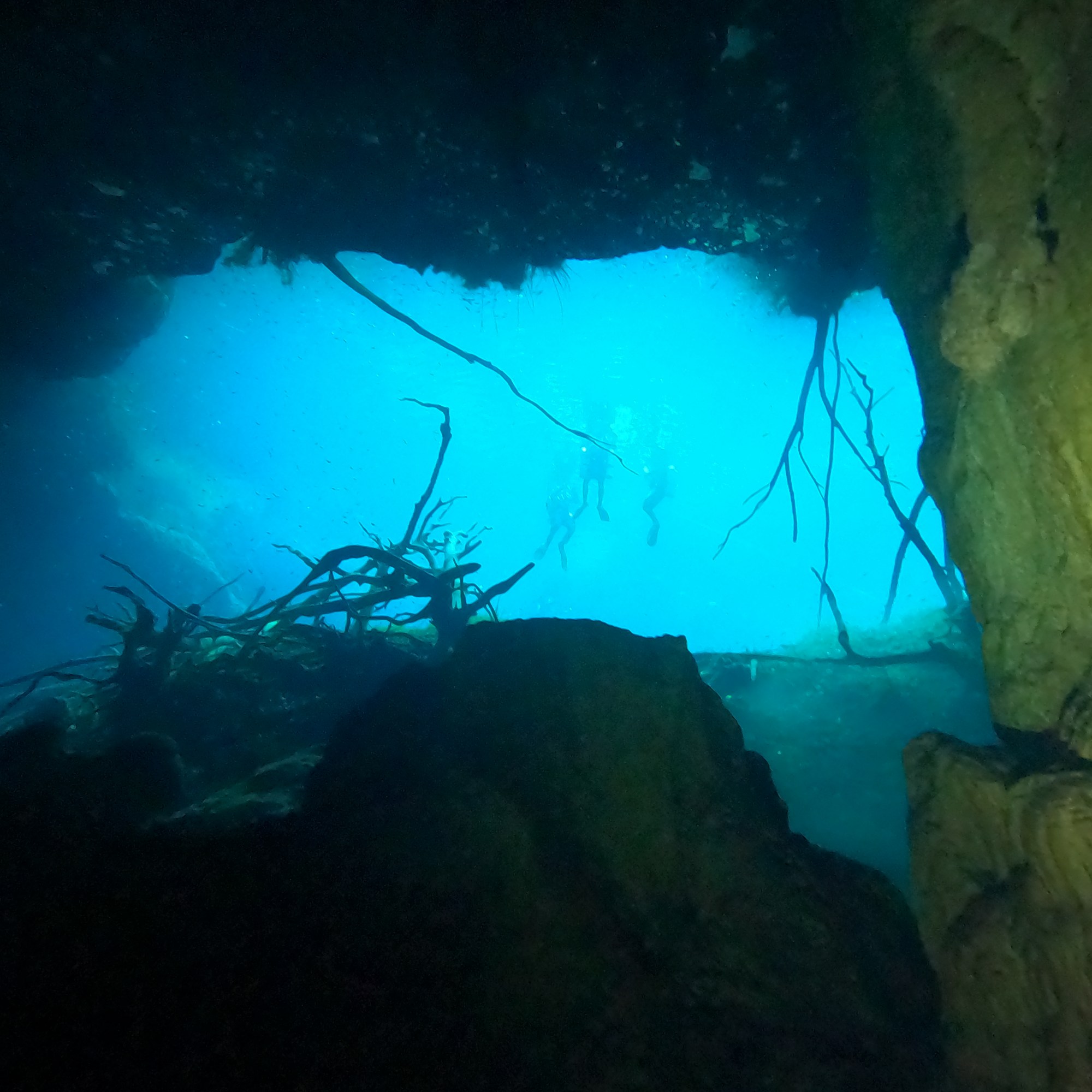 Nous sommes émerveillés et nous poursuivons ainsi la journée vers Car Wash, un cenote en bord de route, anciennement utilisé par les chauffeurs de taxi pour laver leur voiture. Une fois les bouteilles sur le dos et avant la mise à l’eau, nous apercevons, assez proche de nous, un alligator à la surface. Notre guide nous invite à aller rapidement à l’eau pour le suivre. Nous savions qu’il était possible d’en voir un dans cette cénote mais nous n’avions pas imaginé pouvoir nager avec lui. Ainsi, sous l’eau, à deux mètres en dessous de lui, nous le suivons tranquillement. Il mesure un peu moins de deux mètres et nous avons conscience de vivre quelque chose d’unique. Il s’arrête sur le bord de la cenote, près de la végétation où se trouve une petite tortue marine. Dans un coup de queue puissant, il disparaît dans l’eau trouble pour chasser la tortue, en vain. Nous poursuivons ainsi notre plongée dans la partie visible de la cenote. C’est un véritable jardin japonais aquatique. Des poissons colorés se baladent tranquillement au milieu des racines de lotus faisant surface, 4 mètres plus haut. L’univers est féerique et nous hallucinons de la beauté de ces fonds. Nous continuons notre route vers la partie sous-terraine de la cenote, dans une grotte ayant servi, il y a quelques dizaines de milliers d’années, de caverne à nos ancêtres. Nous cheminons ainsi pendant 25 min, guidés par nos lampes, dans ce refuge aujourd’hui immergé. La cavité est énorme et nous imaginons la vie qu’il pouvait y avoir ici auparavant. C’est vraiment une chance incroyable de pouvoir vivre ce genre d’expérience et, à mesure que nous avançons, nous savons que nous sommes en train de vivre une de nos plus belles plongées. Le contraste entre la nuit de la caverne et la lumière bleue-verte qui se dégage de l’entrée nous laisse rêveurs et nous enregistrons ces images en nous pour le reste de nos vies.