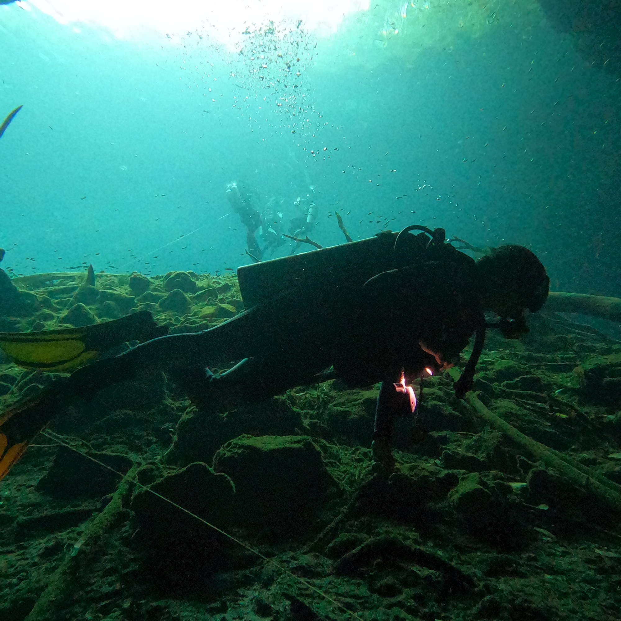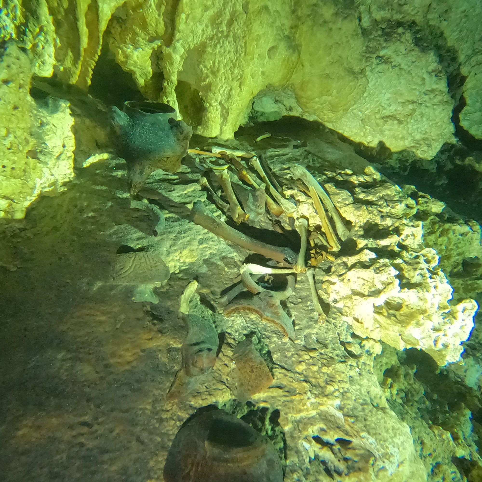 L’ambiance est incroyable, nous sommes dans le noir, éclairés seulement pas nos lampes et nous découvrons une grotte aquatique nous révélant ainsi stalactites, stalagmites et quelques vestiges préhistorique (ossements, poterie…). Pendant 40 min nous cheminons ainsi dans ce labyrinthe de roche et d’eau dans un calme indescriptible. Nous sommes moins agités que dans la mer et l’eau douce, pure et sans sédiments, nous permet d’avoir une telle visibilité que nous oublions parfois que nous sommes dans l’eau… Au final nous aurons fait une pénétration de 20 minutes, signifiant que, au bout de la grotte, le seul moyen de retrouver la surface est de faire 20min en sens inverse!!!