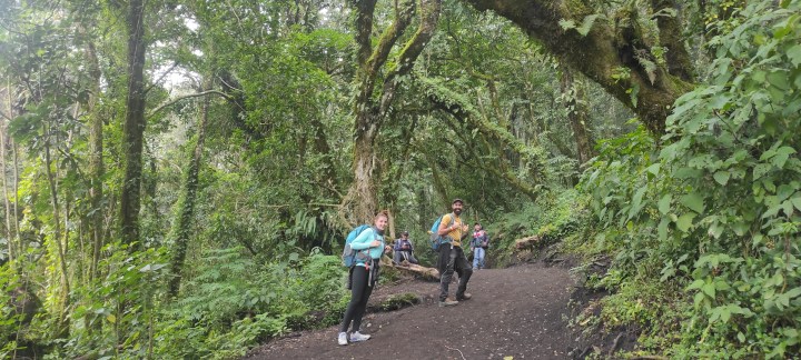 Les premiers kilomètres se font dans des tranchées entourées de champs de maïs et se poursuivent sur de petits sentiers bordés de buissons fuchsias. Dans un décor brumeux et poétique, des arbres libres et solitaires apparaissent un à un dans les prairies clôturées avant de devenir de plus en plus nombreux. Heureux de retrouver ces forêts de nuage aux allures de jungle tropicale, nous nous extasions face aux fougères, aux lianes et aux racines trop prétentieuses pour se cacher sous terre. Nous ne croisons pas grand monde sur notre chemin mais à notre immense surprise nous reconnaissons quelques visages : la famille Mazel ! L’excitation de se retrouver là par hasard est intensifiée par l’expérience qu’ils viennent de vivre et par celle qui nous attend. Ils nous racontent les larmes de joie qui ont coulées alors qu’ils étaient au sommet saisis par la puissance du lieu et fiers de l’effort accompli en famille. Nous les laissons savourer leur descente alors que plusieurs kilomètres nous attendent encore.