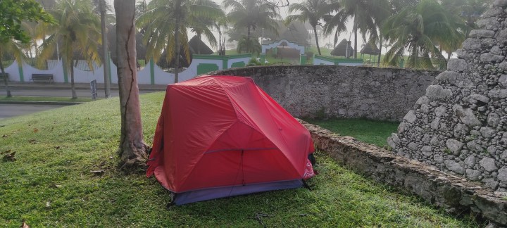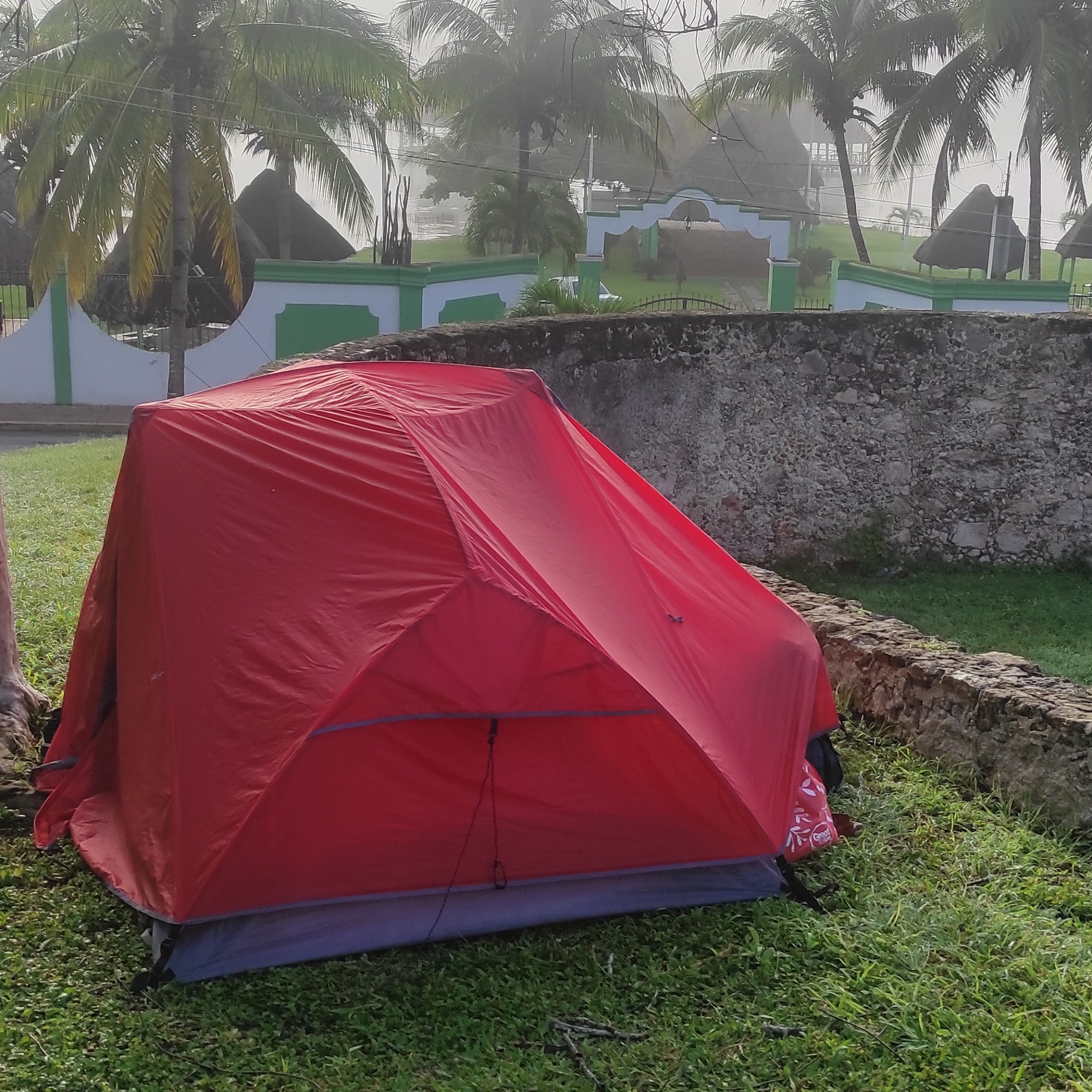 Nous nous résignons donc à faire un détour de plus de 7h de route pour contourner le Guatemala, par le Chiapas et rejoindre Bacalar. Un périple de près de 20h qui nous fera arriver  à 2h du matin sans hôtel réservé. Nous finirons par monter la tente en plein centre-ville, dans le parc de la Forteresse San Felipe construite en 1729 pour permettre aux conquistadors de lutter contre les attaques de pirates. Une nuit plutôt agréable puisque, à notre grande surprise, personne ne nous a réveillé le matin et nous avons pu nous réveiller sans urgence.