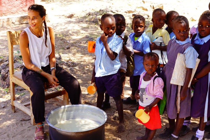 L’école accueille près de 200 élèves, âgés de 2 à 15 ans, dans cet espace de moins de 100m². Les instituteurs (5 lorsqu’ils sont tous présents) jonglent ainsi entre les 7 classes surchargées ou étriquées. De plus, chaque matin, deux institutrices sont réquisitionnées dans une cuisine de 2m² pour préparer le déjeuner pour toute l’école. Tous les jours, du riz et des haricots sont servis à ces enfants qui n’ont probablement pas la chance d’avoir un petit déjeuner et un dîner à la maison. Une fois servis, ils dégustent leur plat assis dans leur salle de classe avant de se défouler dans une cour proportionnelle au reste de l’école (et qui est d’ailleurs également une salle de classe protégée du soleil ou de la pluie par un parasol troué). Ils profitent de ce moment de liberté pour venir vérifier si nos peaux ont une texture différente de la leur et faire glisser leurs petits doigts tout sales dans nos cheveux lisses ou sur nos peaux tatouées. Malgré une chaleur écrasante et un air qui ne circule pas, les enfants portent assidument le pullover qui composent leur uniforme, ajoutant même pour certains des collants en laine ou une doudoune. Chaque vêtement est déchiré, sale, trop petit ou a des boutons en moins, nous questionnant sur le sens de l’uniforme obligatoire. Un jour, alors qu’Ursula prendra l’initiative de recoudre ceux des orphelins vivants avec nous, Alice lui fera comprendre, de façon incompréhensible, que cette initiative n’est pas la bienvenue…