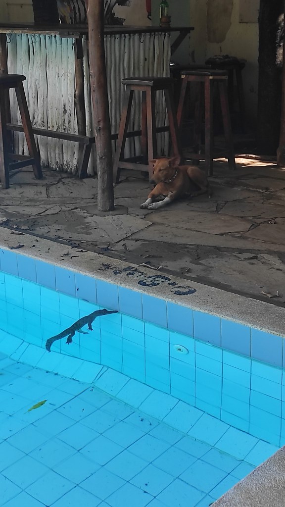 C’est en descendant au bord de la piscine que nous découvrons que ces Vervet monkeys étaient le passe-temps favori des chiens de l’hôtel. S’ils empêchent les singes de venir voler notre nourriture, ils ne peuvent les empêcher de nous embêter… comme cette fois où l’un d’eux, du haut de la charpente, a tout simplement uriné sur la dernière part de pizza de Cristel, une punition pour ne pas avoir partagé plus tôt son déjeuner… Alors que nous avons la chance de pouvoir dormir quelques nuits dans la chambre privée sur le rooftop de l’hôtel, nous nous sommes d’abord émerveillés de voir au réveil la famille de singes présente dans la chambre qui possède une ouverture entre le mur et le toit en feuilles de palmier. Nous avions commis l’erreur de leur distribuer des raisins qu’ils reviendront nous réclamer le jour suivant. Cette fois n’ayant que des chocolats et friandises qu’on ne comptait pas céder, les singes s’agitent. Il est 6h du matin lorsque Cristel, qui revient des toilettes, voit le mâle dominant poser ses testicules bleus sur l’encadrement de la moustiquaire et uriner sur son oreiller, à côté d’Antho, ne manquant pas d’appuyer son acte d’un regard provocateur. Mais malgré ces actes insolents et détestables, nous apprécions toujours les apercevoir. Ils font incontestablement partis des raisons pour lesquelles nous aimons autant rester dans l’enceinte de l’hôtel, là où rien ne se passe vraiment et où le moindre mouvement attire notre attention.